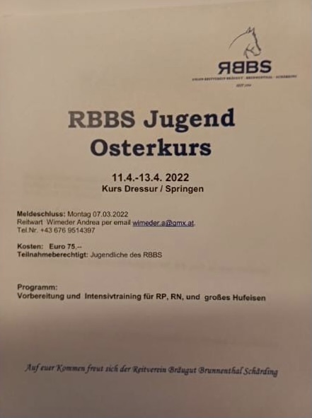 Die Leitung des Kurses übernimmt, ebenso wie das Reitercamp, unsere Reitwartin Andrea Wimeder, die für Fragen unter der Telefonnummer +43 676 9514397 oder per Mail wimeder.a@gmx.at zu erreichen ist.